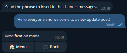 From now on, whenever we send a message related to this set, the word "hello" will be replaced by the chosen phrase.