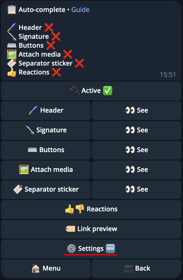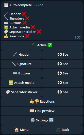 Do you need to send messages in which the content changes but not the outline elements and you are forced to add them every time for each message? Would you like to improve the graphics of your messages without losing the convenience of sending them directly to the channel chat? Auto-complete is the feature you are looking for.