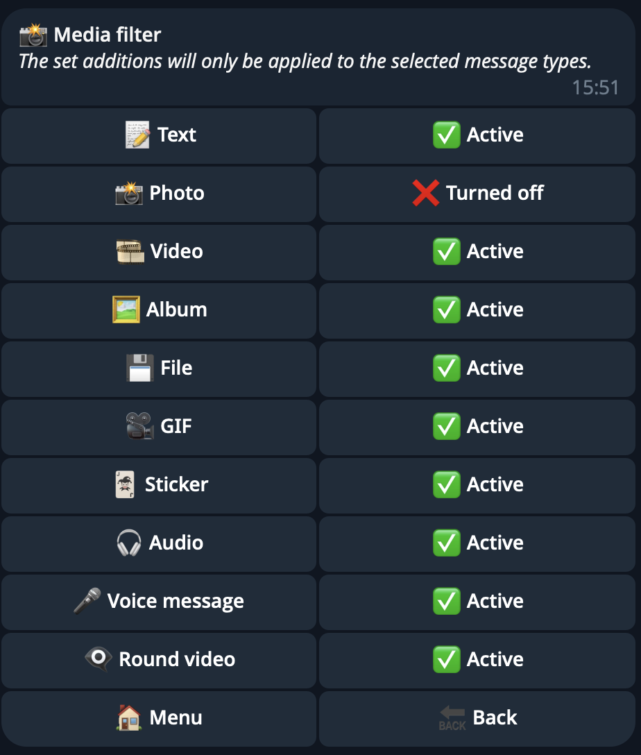 If, instead, we want the set's additions to apply to all messages except those containing a photo, it’s enough to simply deactivate the corresponding setting.