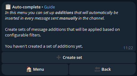 To use this feature in a channel, you first need to create an addition set, which is a collection of elements that will be automatically added to the message sent in the channel.