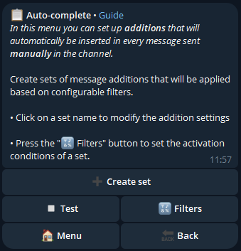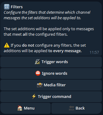 With filters, we can define the activation conditions for the set, the cases in which a manually sent message in the channel should be enriched with the set's additions.