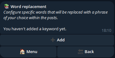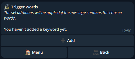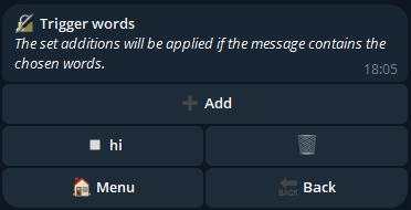 If the message sent in the channel contains one or more of these words, the additions from the set will be applied to the message.
