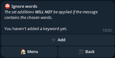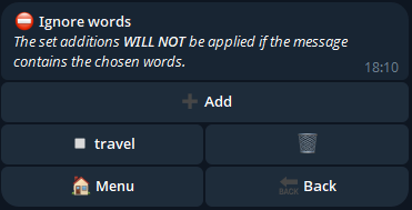 If the message sent in the channel contains one or more of these words, the additions from the set WILL NOT be applied.