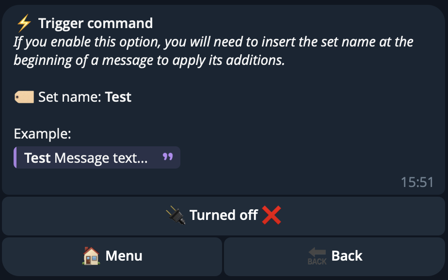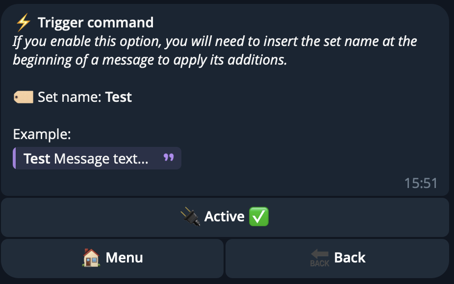 To do this, you'll need to add a special word at the beginning of the message—the trigger command. This command will disappear once the message is sent, and the additions from the set will be applied to that message.