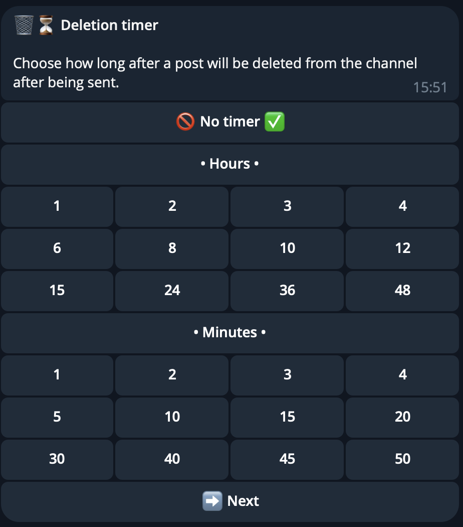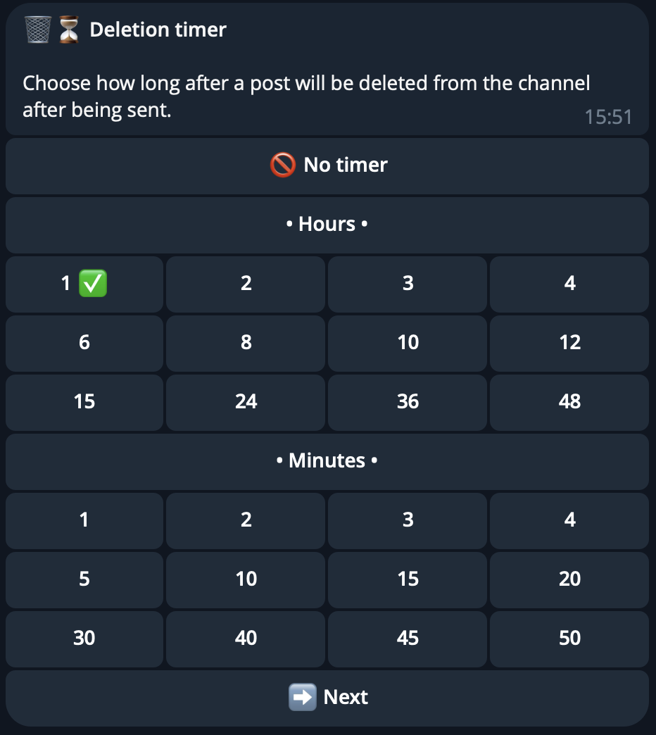 Let’s suppose you want to send promotional messages that should be automatically deleted from the channel after one hour.