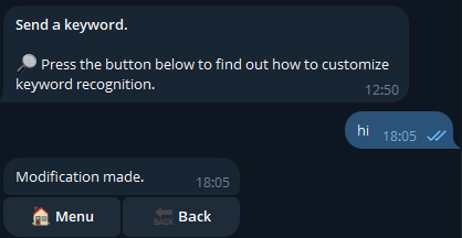 From now on, if we send a message in the channel that contains the added word, the set will be activated for that message. Otherwise, it will not activate, leaving the message as it is.