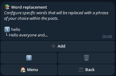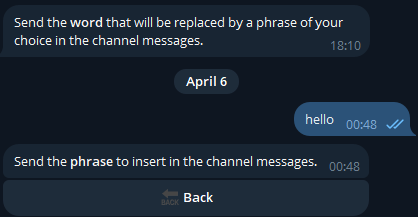 For example, we can set it so that every time we send a message in the channel, the special word "hello" is replaced with a more complete greeting phrase.