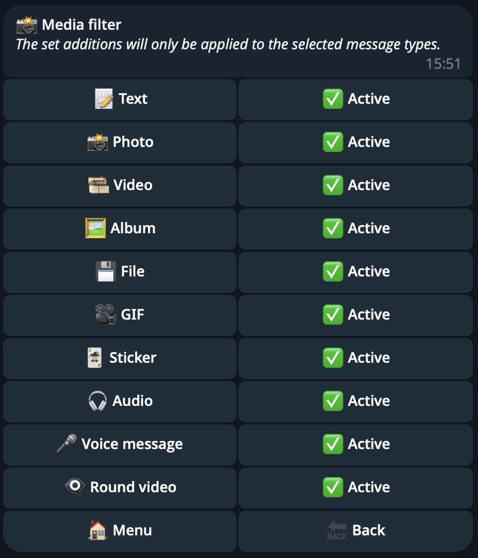 Additions will never be applied to media message types not listed in this menu (such as polls, payments, etc.).