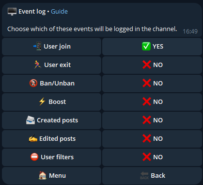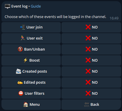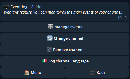From this menu, you can set the language for the log messages, change or remove the secondary channel, but most importantly, manage the events to be logged: