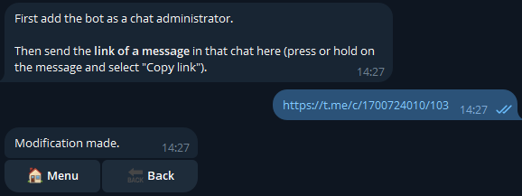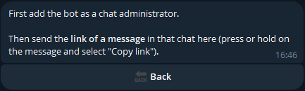 To do this, add the bot as an administrator in the secondary channel; then, retrieve the link of a message sent in the secondary channel by holding the message and selecting โCopy link.โ