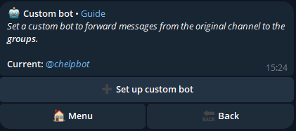 To improve the experience of forwarding messages from the main channel to your selected groups, you can add a custom bot that will send the messages instead of Channel Help.