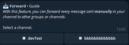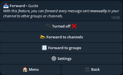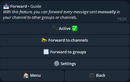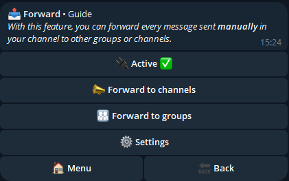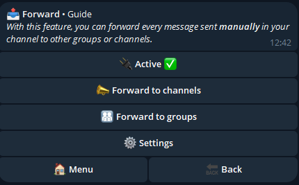 With this feature, you can forward every message sent manually in your channel to other groups or channels.