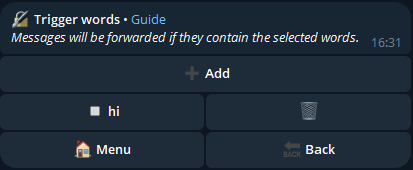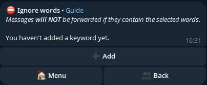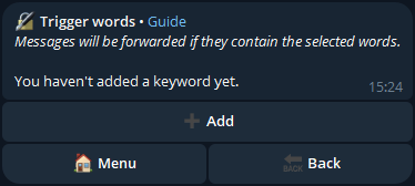 If a message sent in the channel contains one or more of these words, it will be forwarded to the added chats.