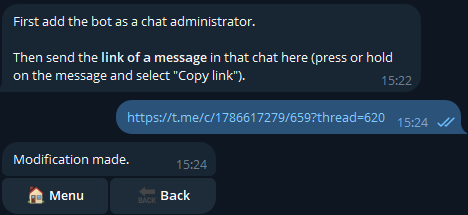 Once these two steps are done, simply copy the link of a message from the group and send it to the bot: