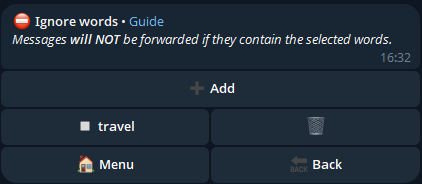 For example: letโs say we donโt want messages related to travel to be forwarded to the secondary chats.