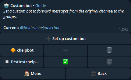 To be able to select the custom bot, it must be added as an administrator in all the forwarding groups that have been added.