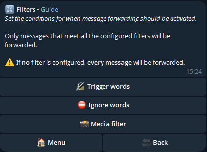 With filters, we can decide under which conditions a message sent manually in the channel should be forwarded to the other added chats.
