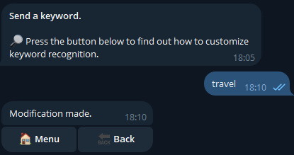 From now on, any message sent in the channel that contains the added word will be forwarded to the other chats.