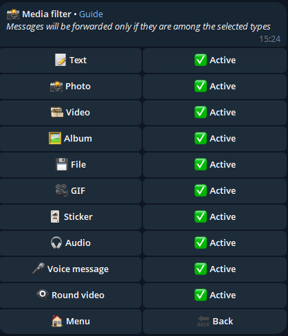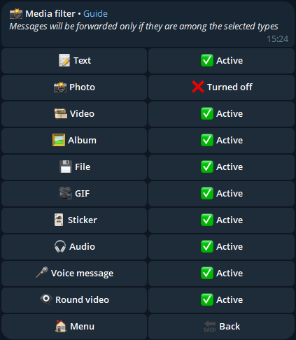 With this filter, you can choose which types of messages will be forwarded to the other chats.