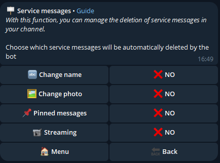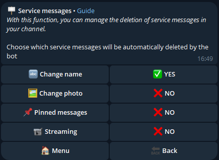 With this function, you can manage the deletion of service messages in your channel.