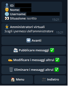 Una volta fatto il bot invierà la situazione dell'utente nel canale e le sue informazioni generali. Se l'utente è iscritto al canale e non è un normale amministratore, sarà possibile decidere i suoi permessi, che hanno lo stesso significato dei permessi standard di Telegram.