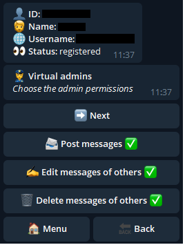 Após feito isso, o bot enviará a situação do usuário no canal e suas informações gerais. Se o usuário estiver inscrito no canal e não for um administrador normal, será possível decidir suas permissões, que têm o mesmo significado das permissões padrão do Telegram.