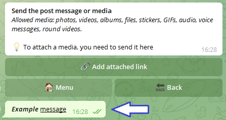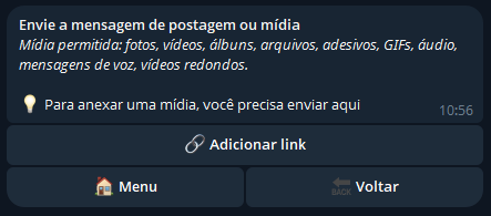 Neste menu, você pode escolher uma mensagem de qualquer conversa para a qual o post que você está criando irá responder. Primeiro, o bot também deve ser um administrador dessa conversa. Depois, você precisa enviar o link da mensagem escolhida: