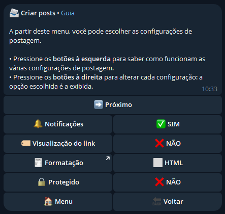 Criar Post é o principal recurso do Channel Help. Ele permite criar mensagens mais elaboradas, chamadas postagens, que não podem ser criadas manualmente de forma alguma. Criar e enviar uma postagem, em vez de enviar uma mensagem normal, torna seu canal mais profissional, pois oferece mais opções de criação e organização; é possível, por exemplo, substituir links inseridos no final do texto por botões reais contendo esses links, ou anexar o logo da sua marca no final da mensagem.