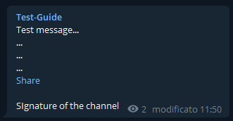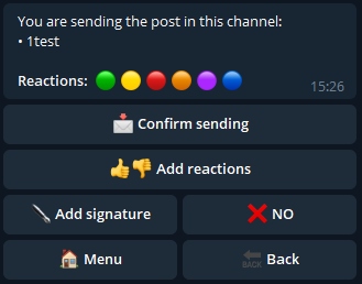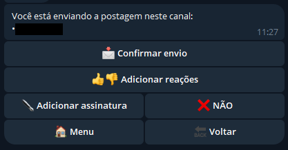 Em ambos os casos, você chegará ao próximo menu, onde o bot mostrará o resumo do canal ou canais nos quais a postagem será enviada e permitirá adicionar Assinatura e Reações.