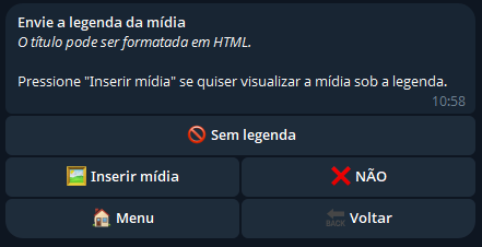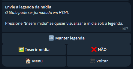 A partir deste ponto, o bot pedirá os elementos que são necessários para a postagem ser criada e, em cada etapa, ele enviará a pré-visualização da postagem.
