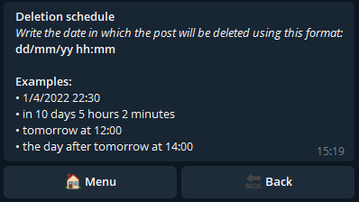 Ao clicar neste botão, você pode enviar a data em que a postagem será excluída do canal. A data deve ser enviada em um dos formatos do exemplo: