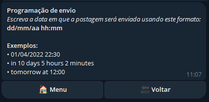 Ao clicar neste botão, você pode enviar a data em que a postagem será enviada no canal. A data deve ser enviada em um dos formatos do exemplo: