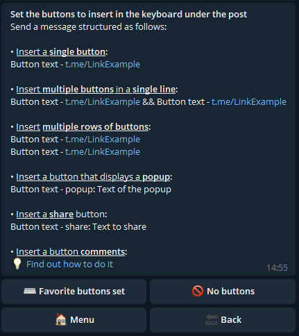 如前所述,使用 Channel Help 可以在消息下方添加按钮。警告:相册,即媒体集合,不支持按钮。