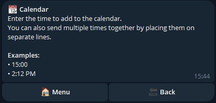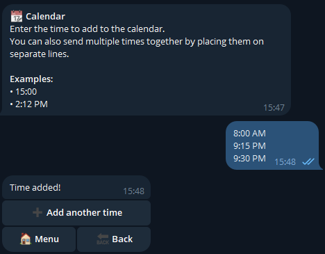 点击“添加时间”后,您需要将时间以两种可能的格式之一发送给机器人,如示例所示,即标准格式和AM/PM格式。