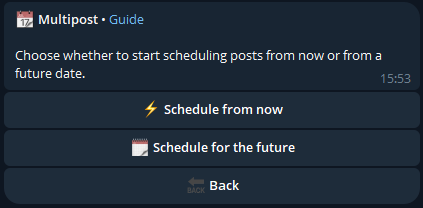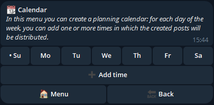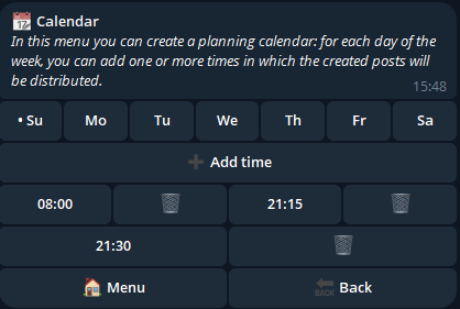 一旦您为每个星期的每一天设置了发布时间,您将能够创建任意数量的帖子,并让机器人在选定的日期和时间自动分发它们,免去手动创建和安排每个帖子的麻烦。