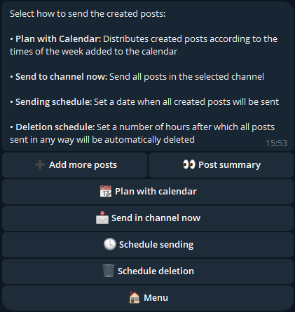 立即发送到频道:将所有已创建的帖子发送到开始时选择的频道。