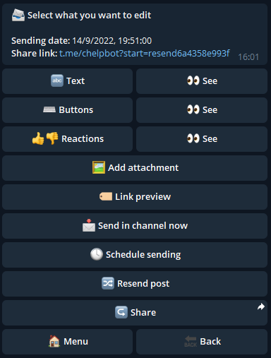 “重新发送帖子”按钮允许您将此帖子重新发送到一个或多个频道,将您带到创建帖子功能的最终菜单。