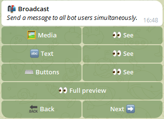 With the broadcast option, it is possible to send a message to all users who have started/written to the bot at least once and who havenโt blocked it (or get banned).