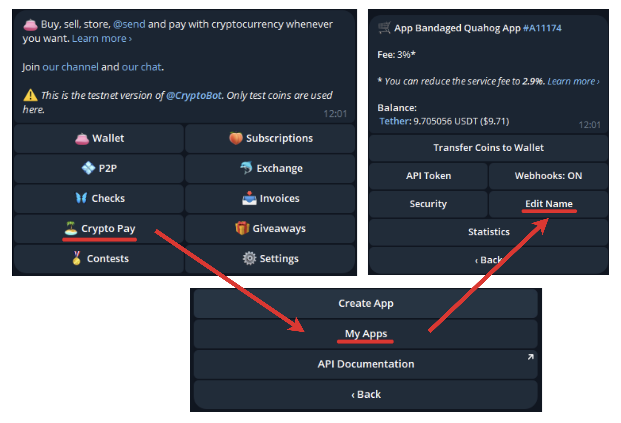 Finally, once all the steps have been carried out also for @CryptoBot, it is recommended to rename your payment "App", i.e. the name that users will see at the time of purchase, as follows: