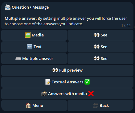 At this point you can insert a text message or media to compose our question to the user by pressing the first two buttons. By then pressing on "Full preview" you will have a preview of what you have added.