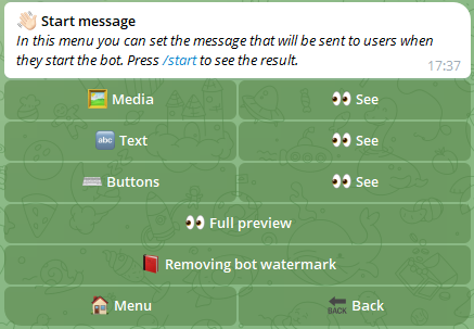 In this menu you can set the message that will be sent to users when they start the bot.