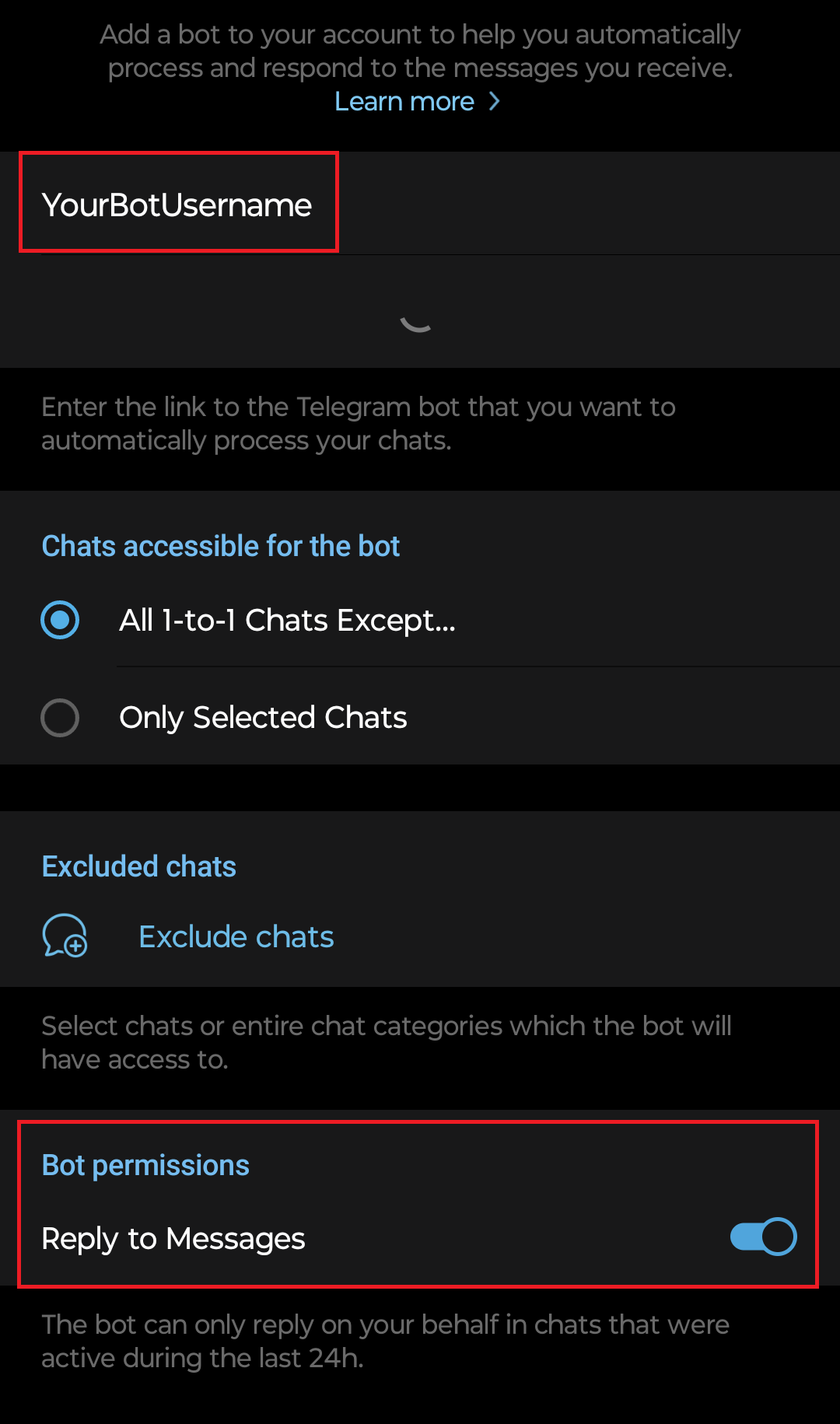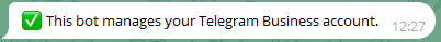 From that moment the bot will be in Telegram Business mode and it will manage your chats, with the methods configured by the bot's settings.