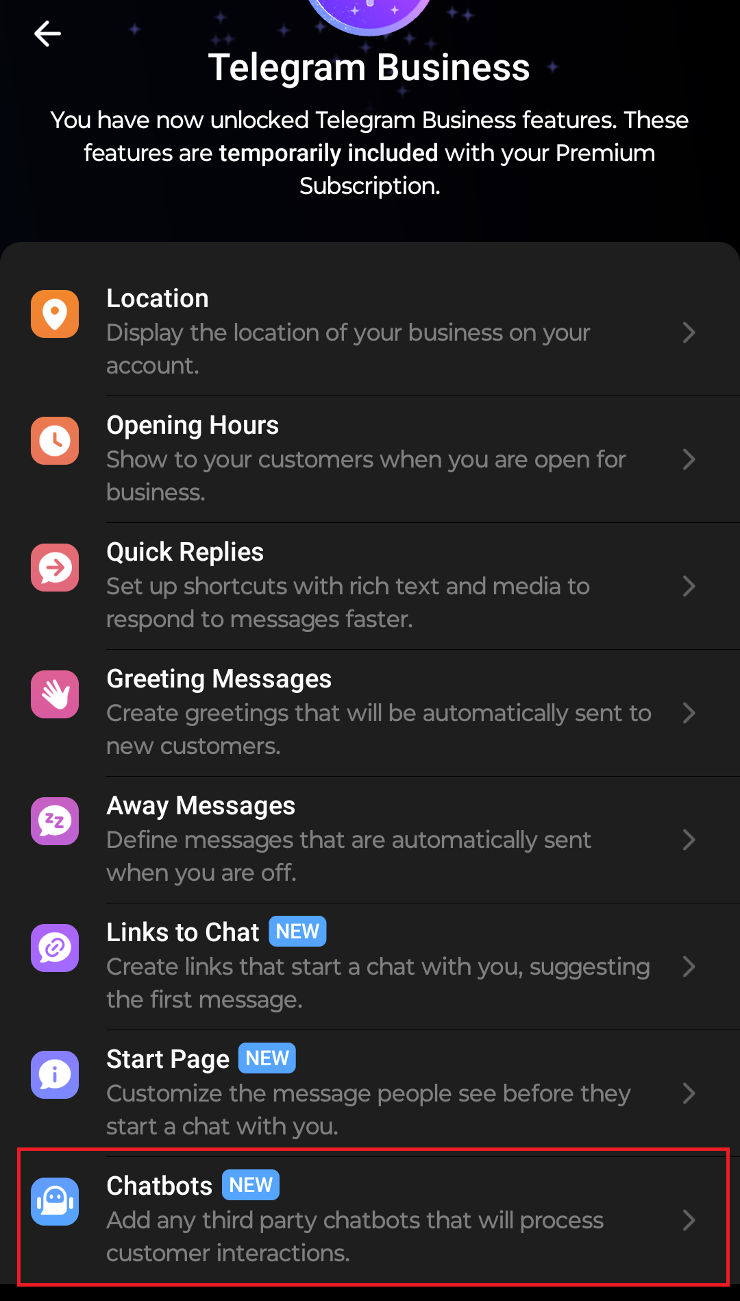 Now you need to go to your โTelegram Businessโ suite, from Telegram settings panel: