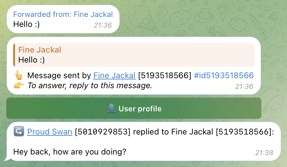 Jika seorang pengguna menulis kepada bot saat mode Topik dinonaktifkan, semua administrator bot menerima pesan pengguna tersebut. Jika seorang administrator membalas, balasan tersebut juga akan ditampilkan sebagaimana mestinya: