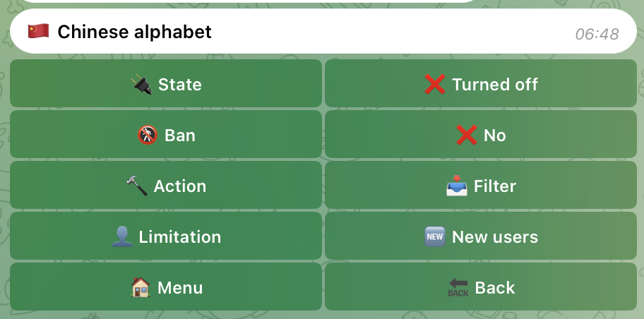 ๐ท Ban | Kemungkinan untuk memutuskan apakah akan memblokir pengguna yang tertangkap oleh filter atau tidak. | โ Ya โ Tidak |