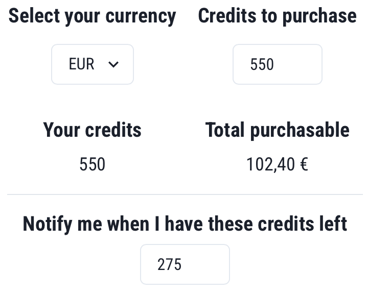 Kita dapat melihat bahwa sistem secara otomatis menghitung Total yang Dapat Dibeli (102โฌ) segera setelah kita memasukkan 550 Kredit.