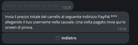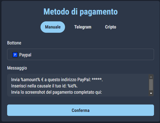 Pembayaran manual terdiri dari pengiriman instruksi pembayaran kepada setiap pengguna yang ingin membeli sesuatu dari toko kami. Instruksi ini harus dikonfigurasi di panel manajemen dan akan dikirim secara otomatis oleh bot kepada setiap pengguna pada saat pembayaran.