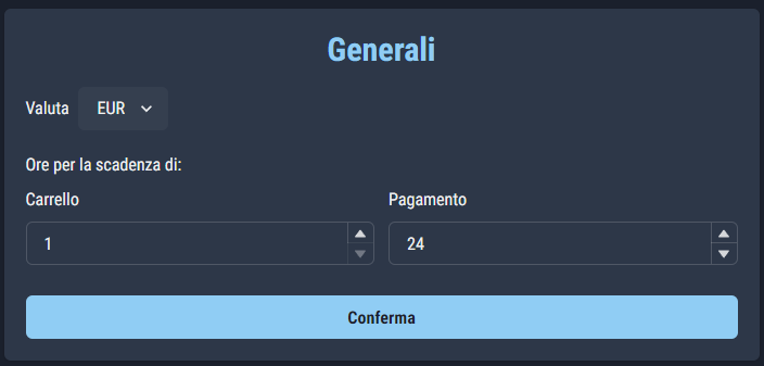 Di pengaturan umum kita menemukan kemungkinan untuk menentukan mata uang toko kita (misalnya EUR adalah Euro, USD adalah dolar AS).