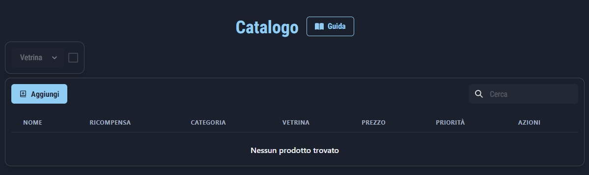 La pagina catalogo si presenta con una tabella che permette di effettuare le operazioni di gestione dei prodotti.