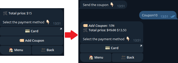 Ad esempio, inserendo 10 come valore del Coupon, verrà applicato uno sconto sul totale del carrello del 10% con la prima modalità e di 10€ con la seconda.